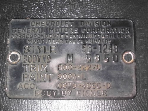 Trim Tag from a 1958 Police Car (COPO 406C) Removed before car was crushed.